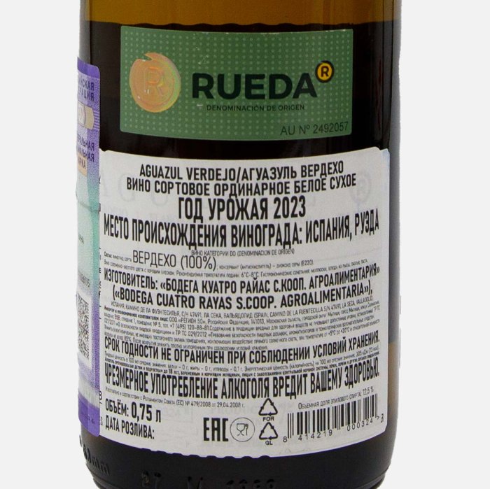 Вино Агуазуль Вердехо сорт орд бел сух 8.5-13% ст/б 0,75л