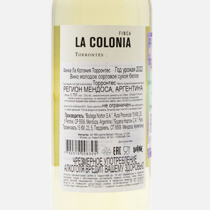 Вино Бодега Нортон Финка Ла Колония Торронтес молсорт белсух7.5-13%0,75