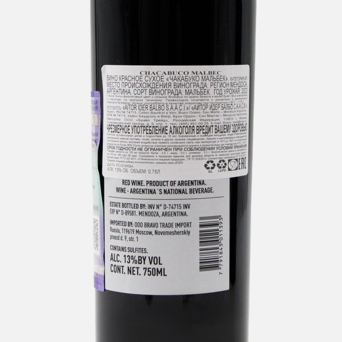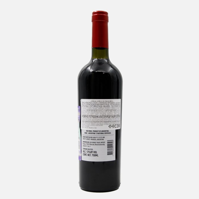 Вино Чакабуко Мальбек ИП кр сух 12.5-13.5% ст/б 0,75л