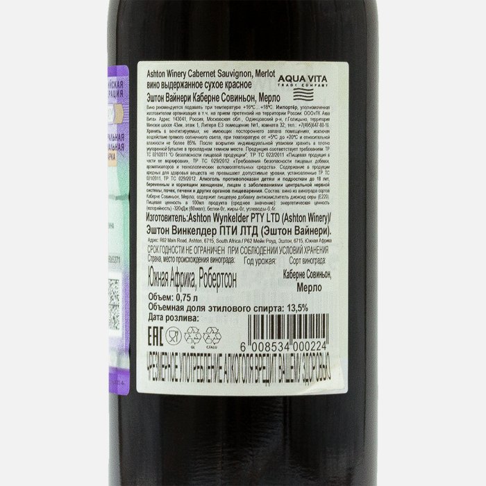 Вино Эштон Вайнери Каберне Совиньон Мерло выдер кр сух10-13.5% ст/б0,75