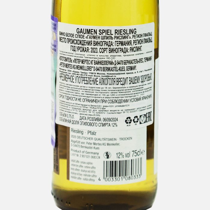 Вино Гаумен Шпиль Рислинг бел сух 11.5-12% ст/б 0,75л