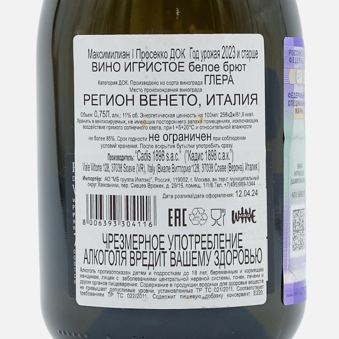 Вино игрист Максимилиан 1 Просекко ДОК бел брют 10.5-11% ст/б 0,75л