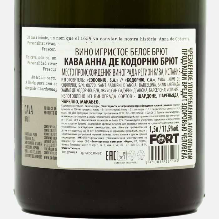 Вино игристое Кава Анна де Кодорню Брют бел брют11.5% ст/б1,5л