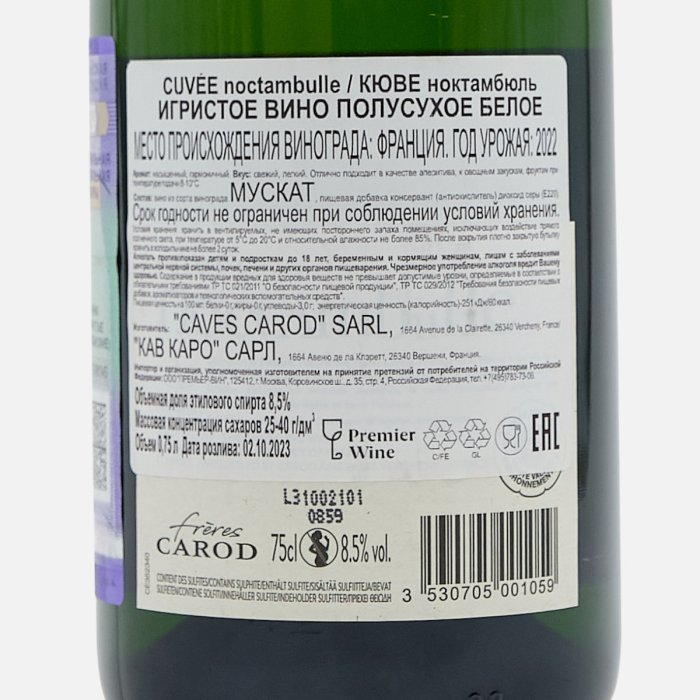 Вино игристое Кюве ноктамбюль бел п/сух 8.5% ст/б 0,75л