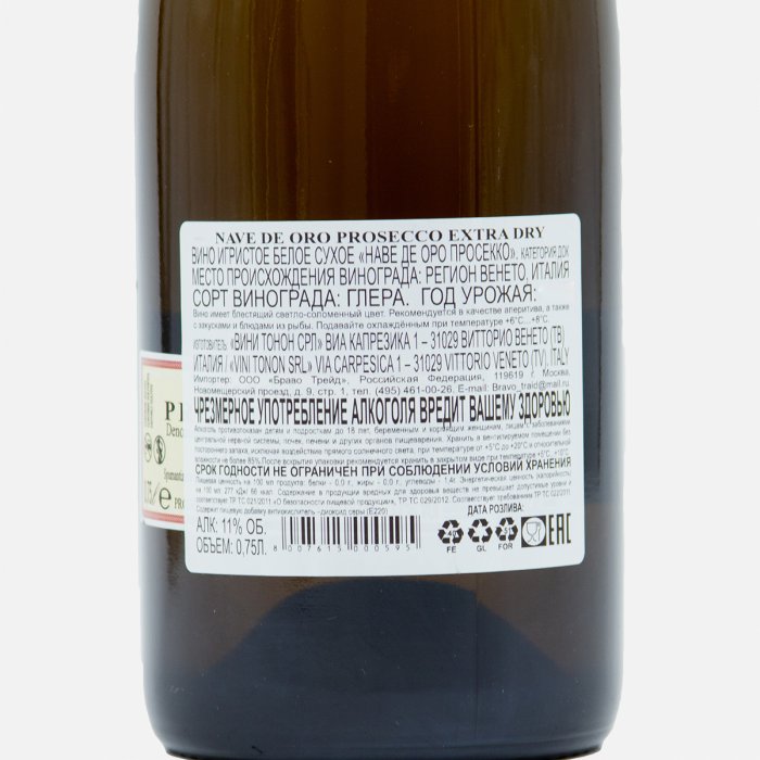 Вино игристое Наве де Оро Просекко бел сух 8-11% ст/б 0,75л
