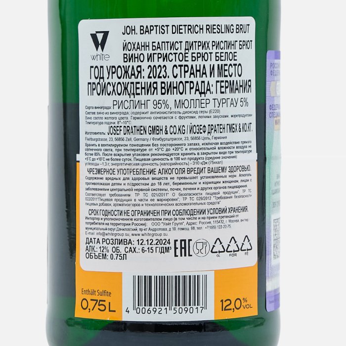 Вино игристое Йоханн Баптист Дитрих РислингБрют бел брют8-12%ст/б0,75