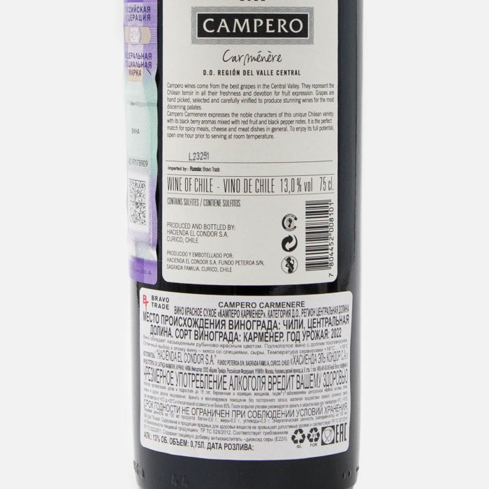 Вино Камперо Карменер ДО кр сух 7.5-13% ст/б 0,75л