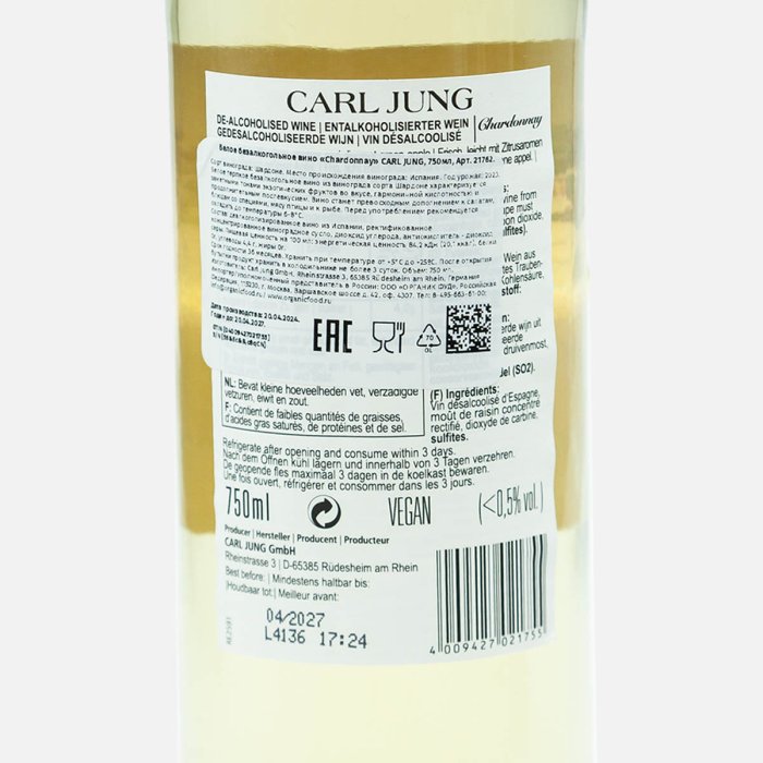 Вино Карл Джунг Шардоне б/алк бел ст/б 0,75л