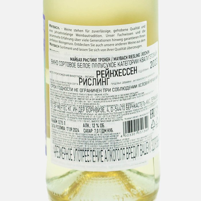 Вино Майбах Рислинг Трокен бел п/сух 11-12% ст/б 0,75л