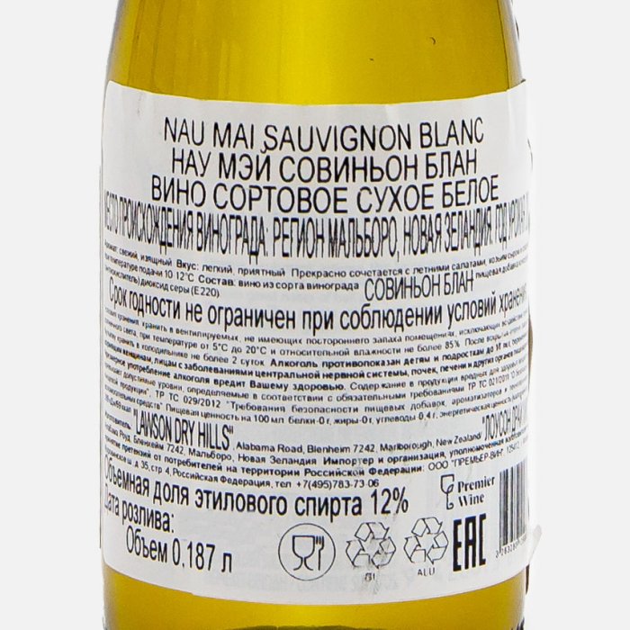 Вино Нау Мэй Совиньон Блан сорт бел сух 12-13% ст/б 0,187л