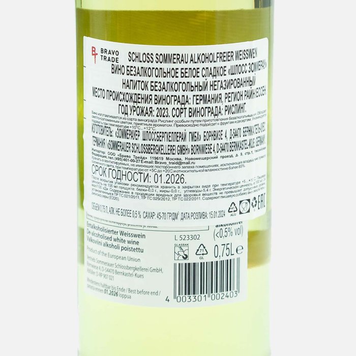 Вино Шлосс Зоммерау б/а 0.5% белое сл ст/б 0,75л