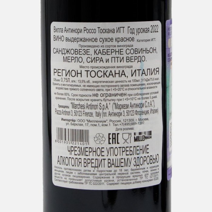 Вино Вилла Антинори Россо Тоскана ИГТ выд кр сух 11-14% ст/б 0,75л