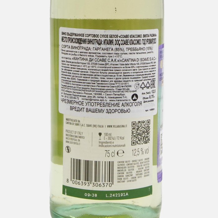 Вино Вилла Разина Соаве Классико бел сух 12.5-14% ст/б 0,75л
