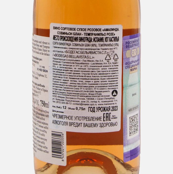 ВиноАмалиндаСовиньонБлан--Темпранил Розе роз сух 12-14% ст/б 0,75л