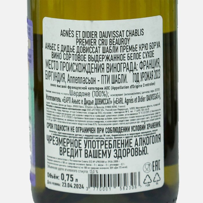 ВиноАньесЕДидьеДовиссатШаблиПремье КрюБоруа сорт выд бел сух0-13% 0,75