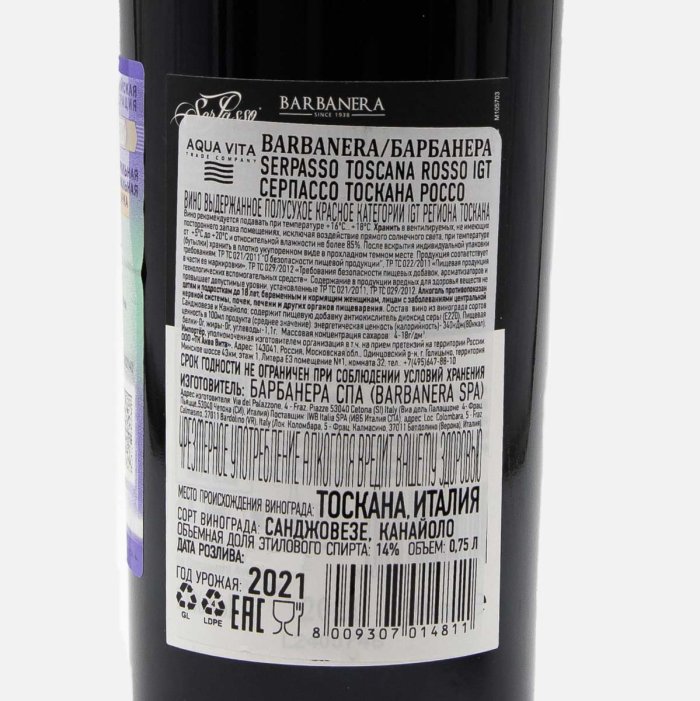 ВиноБарбанера СерПассоТосканаРоссо ИГТ выдер кр п/сух13-14% ст/б 0,75л