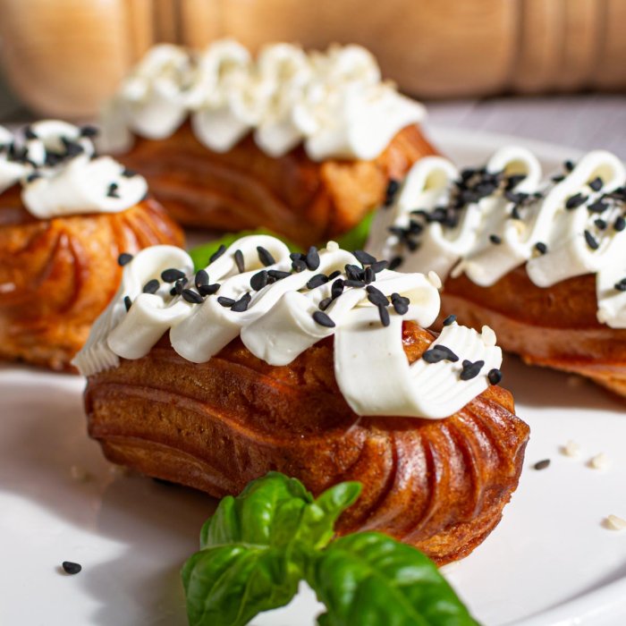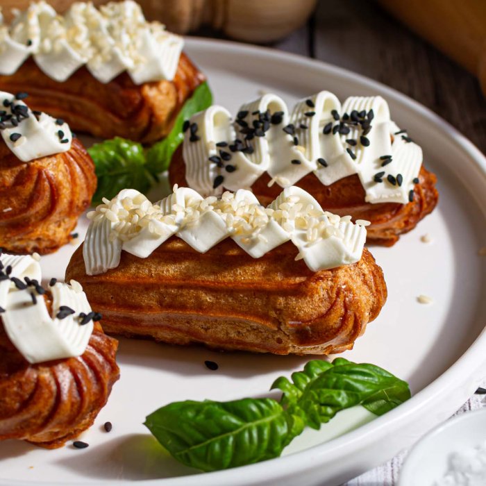 Заварное тесто (смесь для заварного теста, яйцо куриное, масло подсолнечное, вода питьевая), печень трески, сыр творожный, яйцо куриное, кунжут
