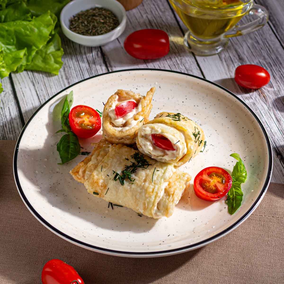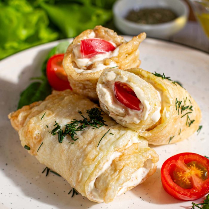 Нежные кабачки в хрустящей панировке сливаются с помидорами и майонезом, создавая насыщенный вкус. Чеснок вносит пикантную глубину, а соль и зелень подчеркивают свежесть. Сочная легкая закуска из качественных ингредиентов.