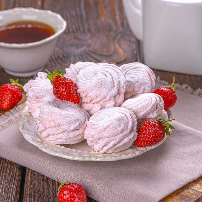 Сахар, яблоки, патока, пудра сахарная, яйцо куриное, клубника сублимированная, агар-агар, ванилин.